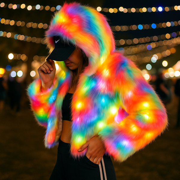 Unlike others, our coat combines vibrant LED lights with cozy faux fur, ensuring you stay comfortable and stylish while being the life of the party.